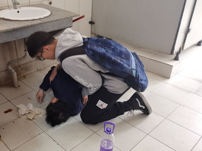 上午10时左右,第一临床医学院2019级临床医学(5+3一体化)专业姚海霖、刘海峰两位同学结束实验课,经过笃行楼一楼男厕时,突然发现一位中年男子摔倒在洗手池边。他们当机立断拨打120急救电话,简要说明情况后,便陪同在场的离退休人员工作处人员赶往校门口,为即将到达的救护车引导方向。与此同时,履行完正常请假手续的该院2020级临床医学专业的裴一凡和孙强两位新生听到有人大喊“有人倒地,寻求急救帮助”,出于医学生的本能,便立刻跑去了现场。