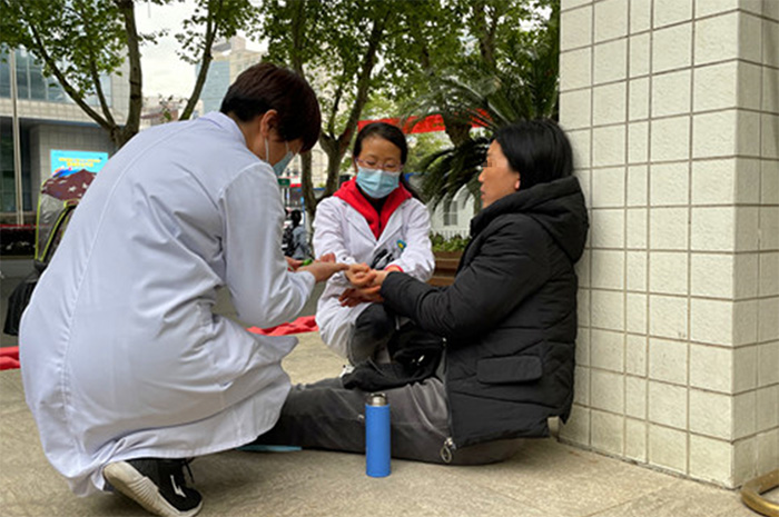 4月19日下午17:30分,正值下班时间,校医院护士长杨晨在校园大门口内侧突然听到有人求助,便立刻冲了过去,将全身无力、脸色潮红、正欲向前栽倒的女子搀扶住,慢慢使其坐下。同时,她还立刻疏通围观人群,解开病人外套拉链,并通知校医院值班医生携带专业器具前来查看。