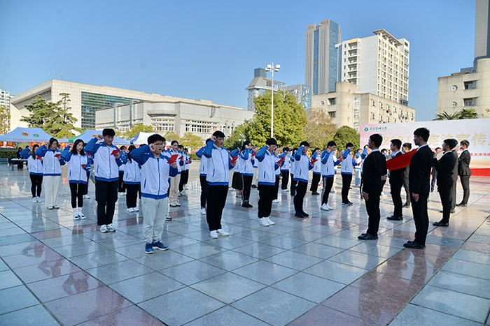 本次活动主题为“以习近平法治思想为指引,坚定不移走中国特色社会主义法治道路”。活动中,我校2021级法学专业新生在该院教师带领下面向国旗和宪法庄重宣誓。铮铮誓词铸忠诚,不仅是同学们对宪法和法律的承诺,更展现了其肩负起中华民族伟大复兴历史使命的担当和决心。现场还开展了宪法知识有奖竞答等活动,并发放了法律知识宣传手册,吸引了我校师生驻足参与。