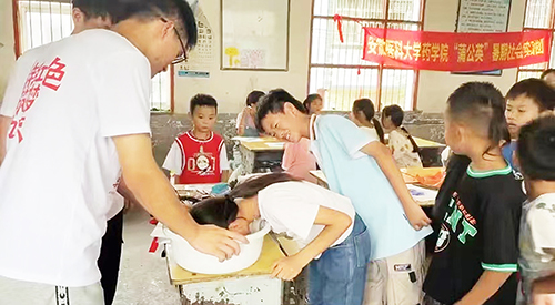 还有很多像“蒲公英”这样的“三下乡”社会实践团队。他们纷纷走进乡村中心小学、少年宫活动中心及社区活动场所向儿童开展防溺水教育。“医路溯源”暑期实践团针对适龄儿童制作“暑期安全小贴士手册”,并和小朋友们一起创作了防溺水黑板报。“情系乡村 医路红途”社会实践团将事故预防与应对相结合,不仅为小朋友开展防溺水知识宣讲,还为家长演示了“海姆立克”急救法。