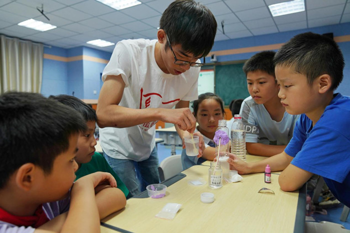 针对本次活动中留守儿童群体的心理需求,团队在与学校负责人充分沟通的基础上,查阅资料、走访调研、研讨课程,确保活动效果最大化。通过举办“我的中国梦”演讲、“青春中国”诗词朗诵,引导孩子们融入集体、展现自我,建立集体归属感、厚植爱国情怀。在理化小实验的手工实践中,孩子们在团结协作中走近科学、发散思维,表现出对科学现象的浓厚兴趣。