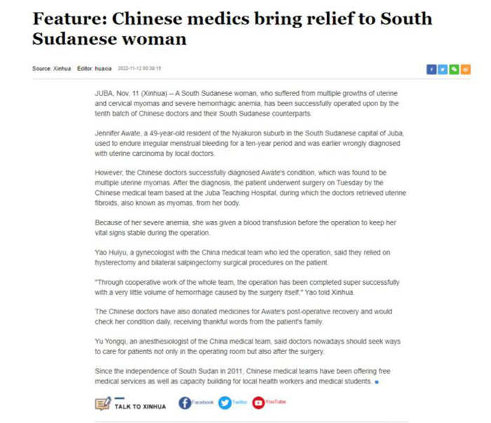 南苏丹当地时间2022年11月8日,安医大附属滁州医院(滁州市第一人民医院)援南苏丹医疗队员在朱巴教学医院顺利完成一例“全子宫+双侧输卵管切除”手术。受到当地医疗同行及群众好评,先后被南苏丹《黎明报》及新华非洲等媒体报道。