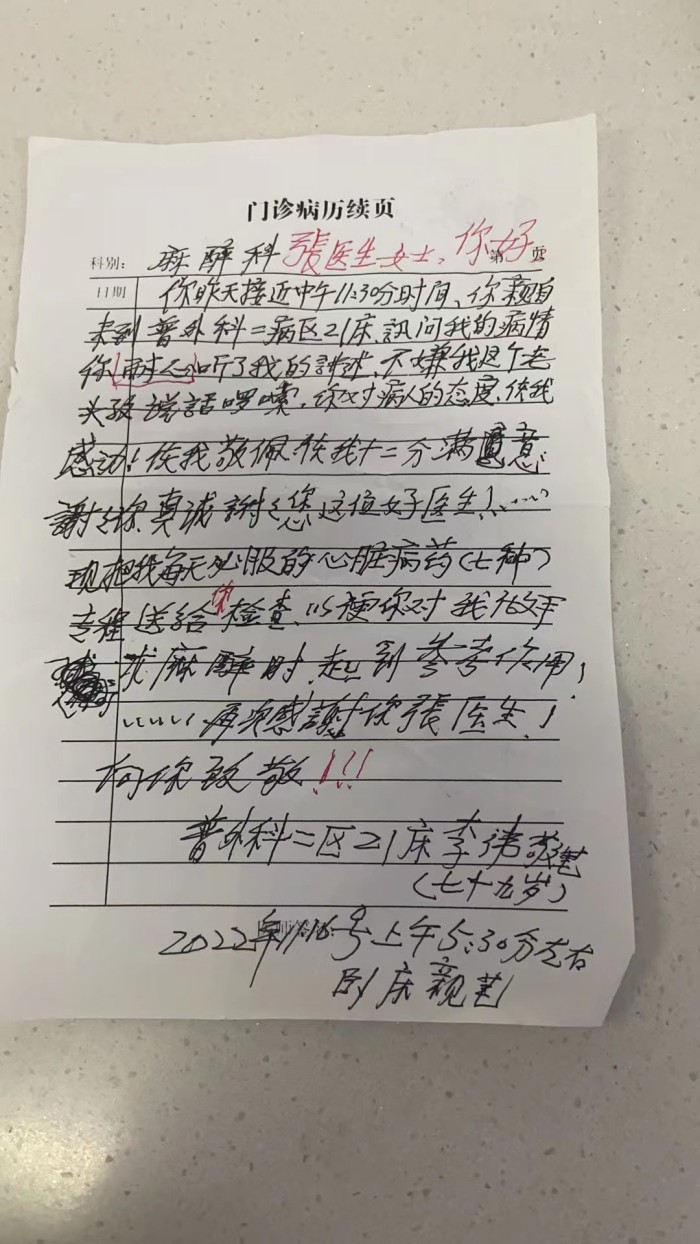 日前,在手术、麻醉、护理团队的共同努力下,李大爷的手术非常成功,并逐步恢复。虽尚未完全康复,但心怀感激的他,用颤巍巍的手写下了发自内心的感谢信。