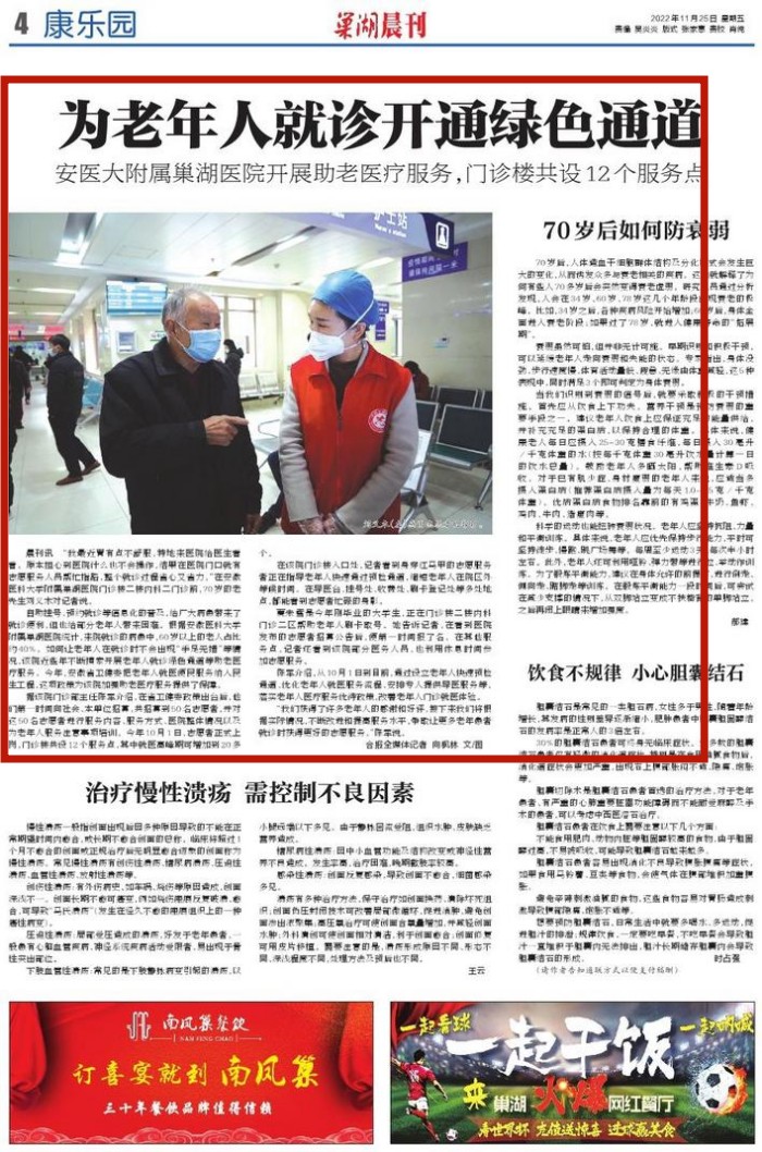 附属巢湖医院统计,来院就诊的病患中,60岁以上的老人占比约40%。如何让老年人在就诊时不会出现“手足无措”等情况,该院近些年不断摸索开展老年人就诊绿色通道等助老医疗服务。今年,安徽省卫健委把老年人就医便民服务纳入民生工程,这项政策为该院加强助老医疗服务提供了保障。