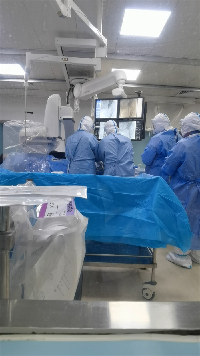 患者入住感染科后,医院迅速协调相关科室完善术前准备,未见明显手术禁忌症,于第二日,为王女士安排手术治疗。医护人员于介入中心穿好防护服及防护面具后,至感染科协助患者及家属做好防护措施(包括佩戴N95口罩、面屏等措施),迅速将患者从感染科转运至介入中心。转运前,为避免院内其他患者及陪护感染,医院协调相关科室,根据应急预案疏散周围无关人员。