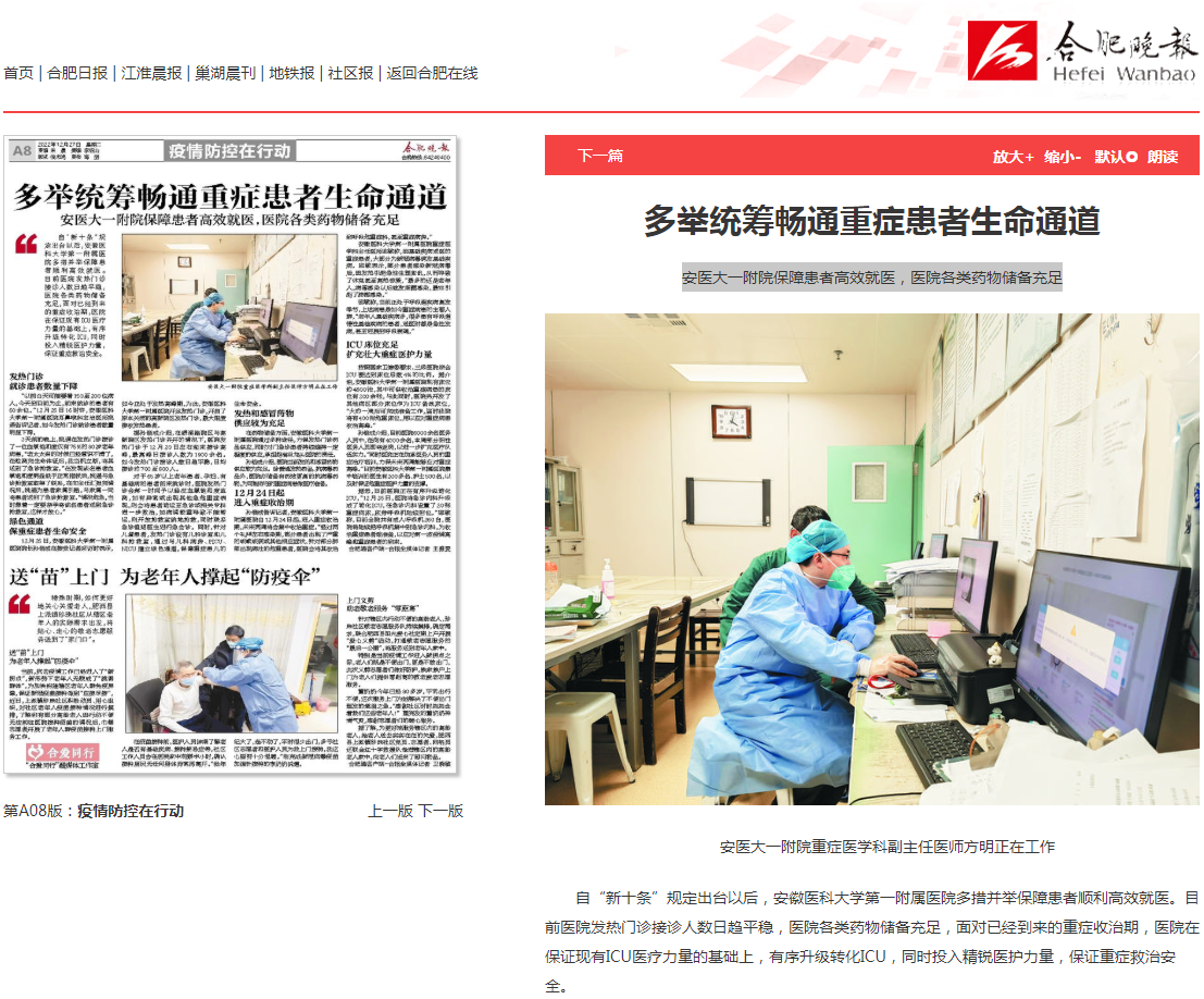 合肥晚报:多举统筹畅通重症患者生命通道 安医大一附院保障患者高效就医,医院各类药物储备充足