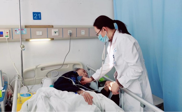 “痰多不多?吃饭怎么样?”“他咳嗽时像这样从下到上拍一拍他的后背······”在安医大二附院血液内科病房,副主任医师侯金晓正在为一名82岁的高龄患者诊察,并指导家属对其进行护理。此名患者患有淋巴瘤、肾结石等基础性疾病,几天前因感染新冠被收治入院,由于高龄且病情较重,春节期间,这名患者在家人陪护下在院接受观察治疗。