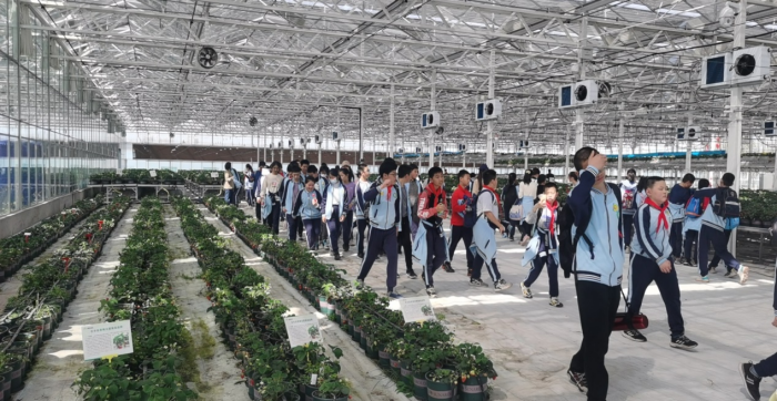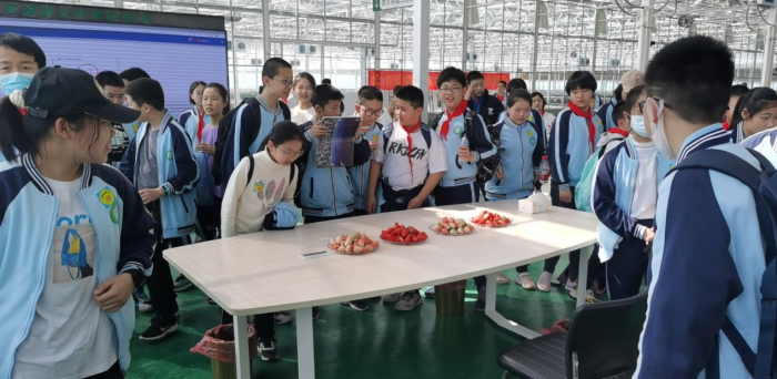 然后,同学们来到智能化农业点,学习长丰草莓文化、无土草莓栽培知识,基地辅导员带着同学们分析了现代农业与传统农业的区别,理解了种植与生活及经济的关系。