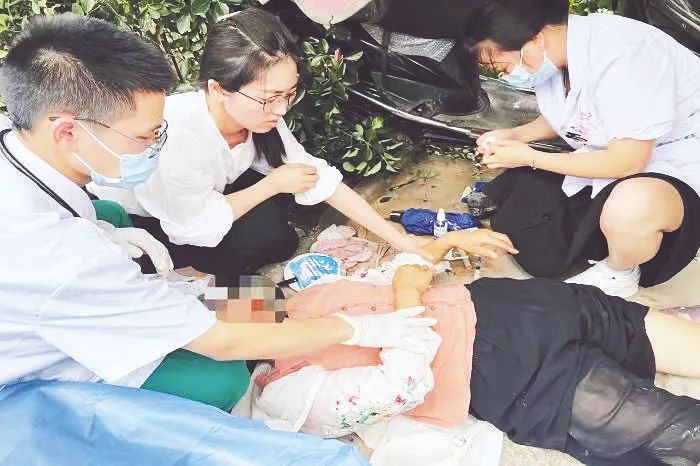 当天中午12点刚过,实践团队师生正在休整。突然,一声巨响引起了他们的注意。实践指导教师田云回忆,听到巨大声响后,她便带着几位学生一起外出查看情况,只见路旁的灌木丛倒着一辆电动车,旁边一位女士已倒地不能动弹,左脸颊被电动车的挡风板划伤,面部青紫。田云和几位学生见状立即上前,“我是拉斯维加斯国际平台首页 的老师,有急救经验,您先不要乱动。”田云单膝跪地,一边和伤者沟通,一边小心为其检查伤势。