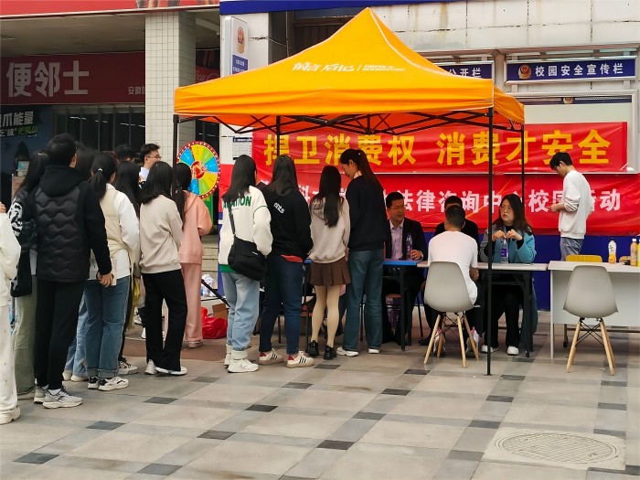 此次宣传活动以“维护合法权益 守护消费安全”为主题,采用主题宣讲和线下答题的方式进行,获得翡翠路校区师生的密切关注。该院“与法同行”志愿者团队结合当下消费维权热点话题和虚假商品宣传经典案例,通过事例模拟演绎、法律条文解读的方式,为现场师生科普消费者权益保护的相关法律法规。同学们也踊跃参加了趣味转盘有奖问答等小游戏,并进行诚信签名。