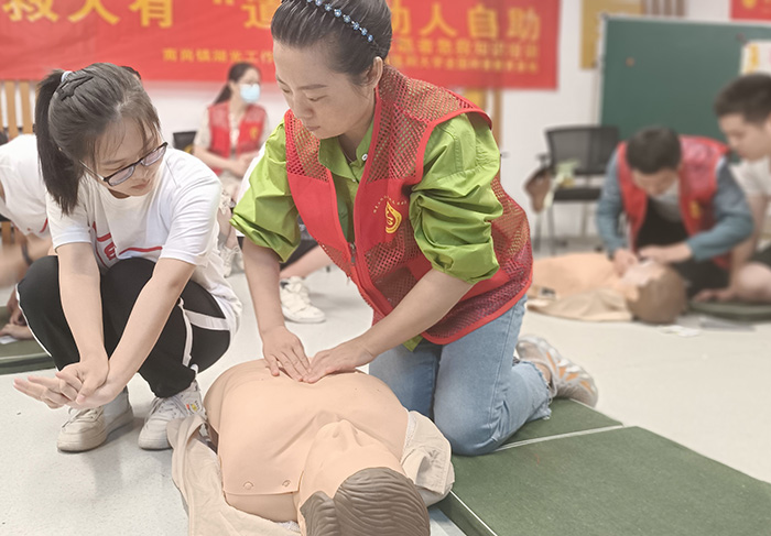 该校青年学生在科普基地组织的活动中指导社区工作人员进行心肺复苏操作。张希冉 摄