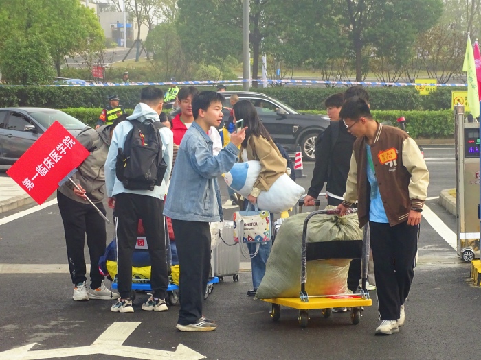 志愿者们是迎新现场最亮丽的风景线。学院组建的由行李搬运车、小推车组成的第一临床医学院青年志愿服务车队穿梭于校园中。身着统一服装、佩戴工作证的导生和学生志愿者或帮助搬运行李,或介绍校园生活,或指路答疑,热情服务如红色的旗帜彰显着奉献精神,让新生们感受到家的关怀与温暖。“志愿者们太热情了,让我在陌生的环境中感受到了浓浓的温暖。他们的帮助让我很快就适应了新环境。校园的景色也很美,漫步其中,心情格外舒畅。”新生小王感动地说。