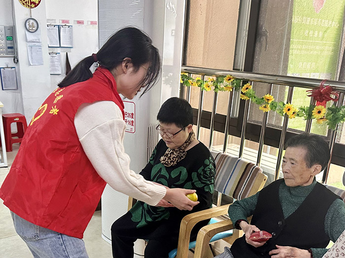 活动当天,同学们身着统一的志愿者红马甲走进养老院,为老人们送上精心准备的水果、牛奶、零食等慰问品。在养老院工作人员的协助下,同学们用心布置会场,或推着轮椅或搀扶,帮助行动不便的老人到达活动地点、顺利入座。随后,同学们按照分工有序开展志愿服务,有的同学为老人送上写满祝福语的明信片,暖心陪老人聊天,了解他们的生活和健康状况,聆听他们的人生故事;有的同学表演手指操和太极拳,耐心协助老人们掌握动作要领,完成每一个动作,并向他们宣传普及健康养生相关知识;还有的同学与老人们一同开展“击鼓传花”的游戏,现场气氛既欢乐又温馨。看到同学们贴心的举动和精心准备的活动,有的老人即兴演唱歌曲,用歌声表达喜悦以及对学生志愿者们的谢意。