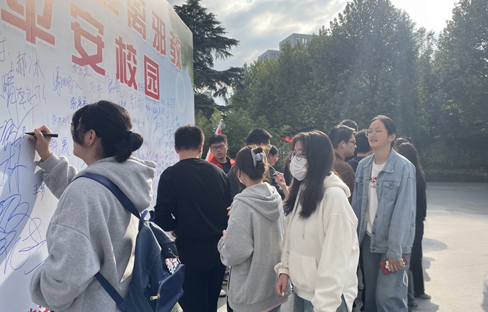 当天下午15时,工作人员与学生志愿者们在图书馆旁铺开展台、竖起展板,向现场师生宣传发放各类反邪教宣传材料和定制宣传品。参与活动的师生在反邪教签名墙上郑重签名,表达远离邪教、共建和谐校园的坚定决心。