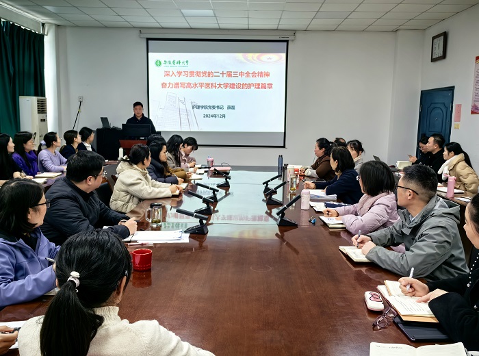 12月20日,护理学院党委举办学习贯彻党的二十届三中全会精神专题党课,学院党委书记薛磊以《深入学习贯彻党的二十届三中全会精神,奋力谱写高水平医科大学建设的护理篇章》为题,为学院党员干部及教师讲授专题党课。