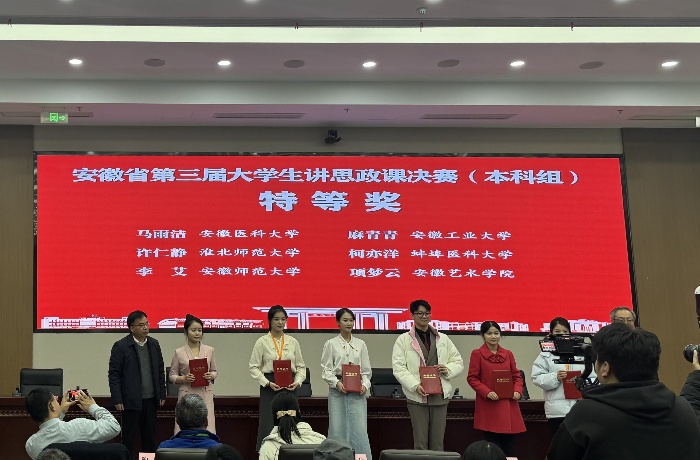 12月25日,由中共安徽省委教育工委主办的安徽省第三届大学生讲思政课决赛举行,我校马克思主义学院2023级研究生马雨洁团队勇夺特等奖,团队指导教师马金琳、周师获“优秀指导教师”荣誉。