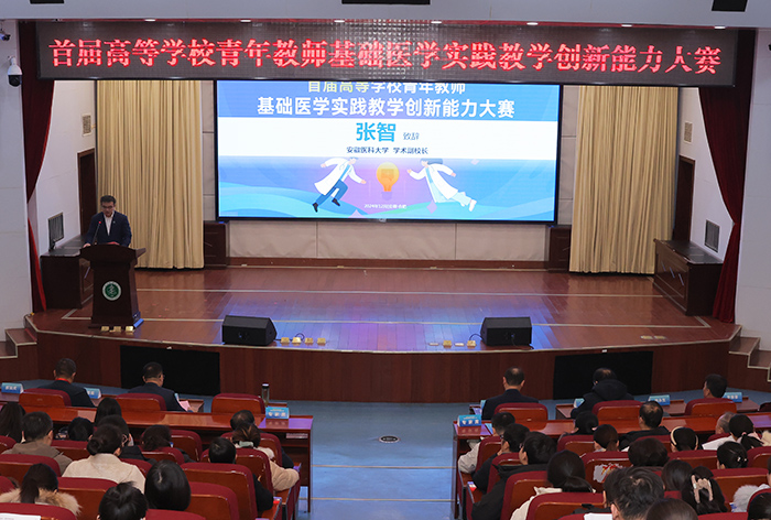 张智在致辞中指出,高等医学院校作为重要的育人基地,担负着国家培养高水平医学人才的历史使命。希望本次大赛搭建起一个良好的交流平台,为切实提升高校青年教师实验教学能力,进一步激发教师教学创新潜能,更好培养新时代高水平医学人才提供坚实支撑。