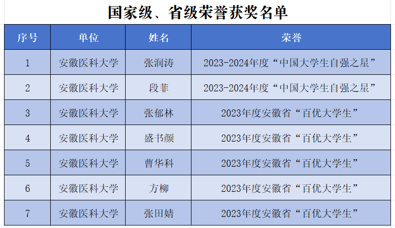 近期,2023-2024年度“中国大学生自强之星”奖学金和2023年度安徽省“十佳百优大学生”奖学金评选结果相继公布,我校第一临床医学院张润涛、临床药理研究所段菲荣获“中国大学生自强之星”,第二临床医学院张郁林、第一临床医学院盛书颜、曹华科,公共卫生学院方柳和临床药理研究所张田婧获评安徽省“百优大学生”。
