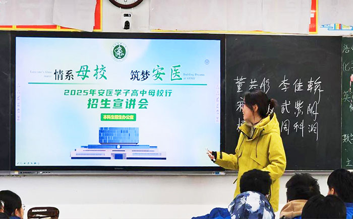 还没放假,2024级的张子尧、吴丹辰、陈湘、母绍琪、司阳康等同学便早早报名参加了“安医学子高中母校行寒假招生宣传实践活动”,并接受了由学校统一组织的培训。寒假期间,他们分别重返母校,通过PPT及视频资料展示我校历史沿革、师资力量、校园风采,他们还从专业选择、课程学习、素质拓展和生涯规划等多个维度为学弟学妹答疑解惑。张子尧在谈到收获时说道“母校之行让我更加明白了榜样的含义,促使我更加明确未来专业学习的奋斗方向,对走好大学路、人生路更加充满动力”。