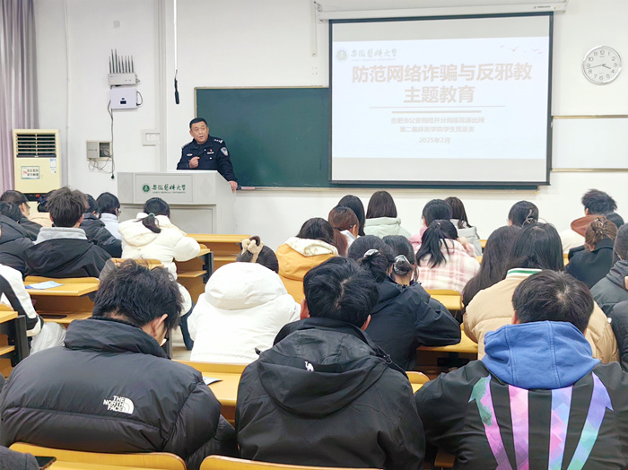 2月17日下午,第二临床医学院在南校区开展新学期“防诈骗与反邪教安全教育”主题讲座,合肥市经开区莲花派出所民警周琼受邀作宣讲。