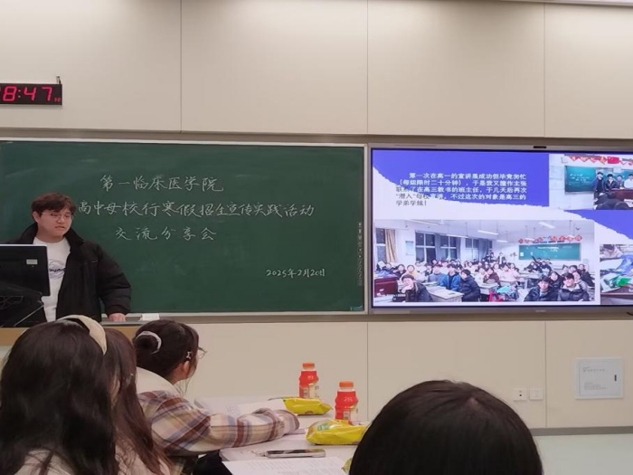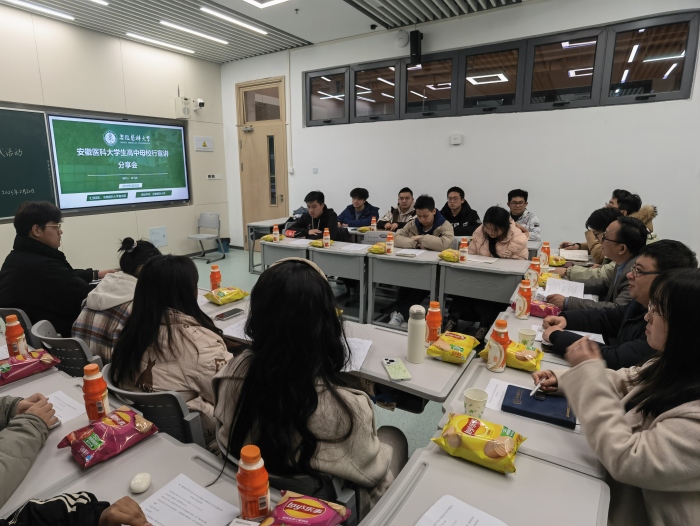2月20日晚,第一临床医学院在新医科中心教学楼E404教室开展“情系母校,筑梦安医——2025年高中母校行寒假招生宣传实践活动”交流分享会。学院学生工作部副部长孙民出席交流分享会,院学生党总支办公室负责人、全体新校区辅导员及学生代表参加。