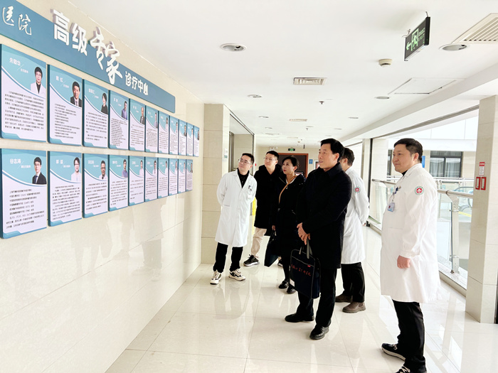 鲍丙刚一行实地参观了医院门诊大楼、住院部、特色科室等区域,并就医院科室管理、团队建设及配套设施等方面进行详细了解。