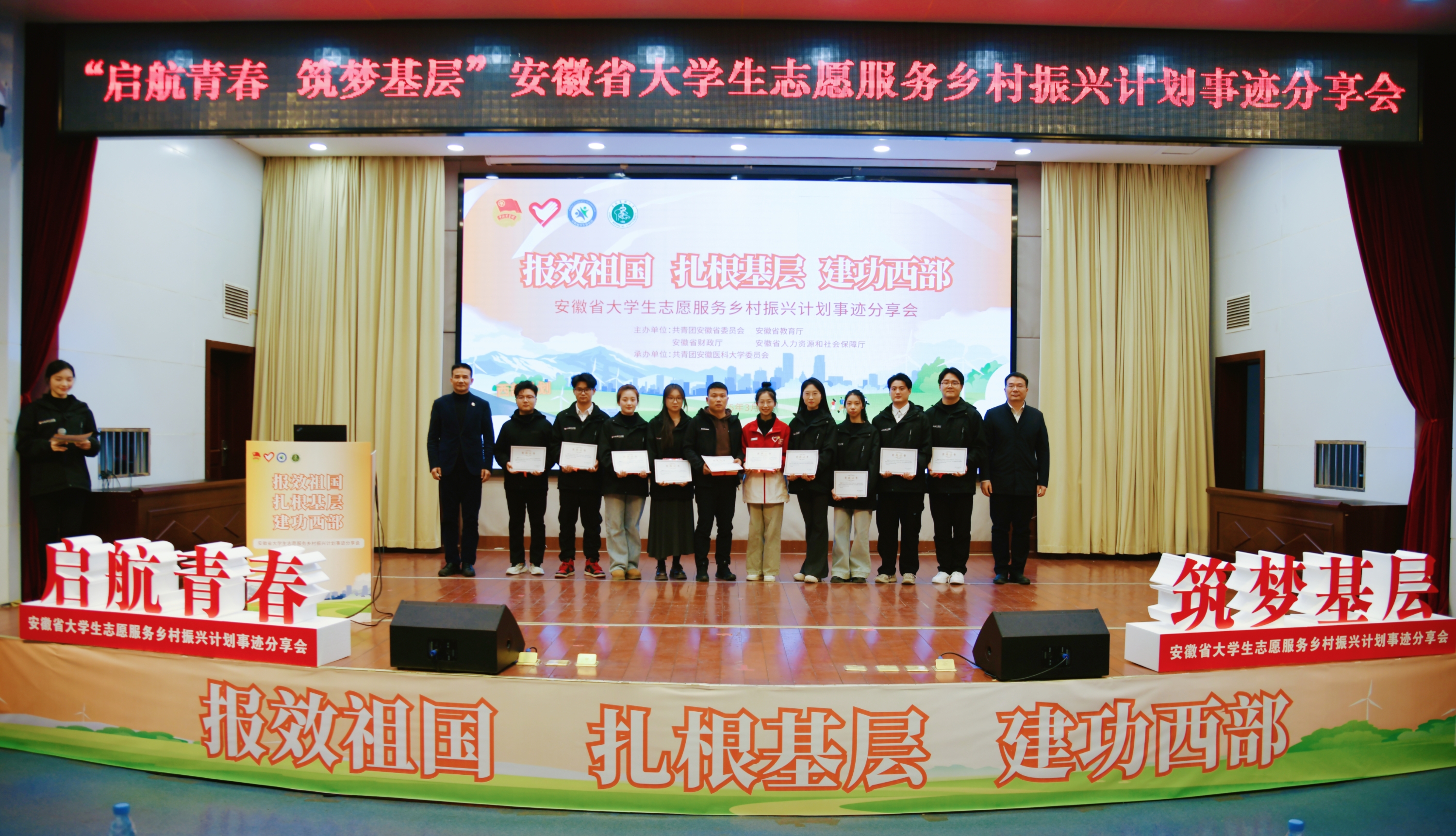 分享会上,播放了大学生志愿服务西部计划主题曲和微电影《到西部去》,发布了安徽省大学生志愿服务乡村振兴计划宣传片《逐梦皖美乡村 绽放青春芳华》。7名大学生志愿者代表依次向大家作事迹分享,我校精神卫生与心理科学学院2024届毕业生叶子馨作为其中一员向大家讲述自己的志愿服务经历。西部计划安徽省项目办负责同志就2025—2026年度大学生志愿服务西部计划、安徽省大学生志愿服务乡村振兴计划作情况介绍,并与现场师生展开交流,就相关问题作解答。分享结束后,与会领导为分享团成员颁发实践证书并合影留念。