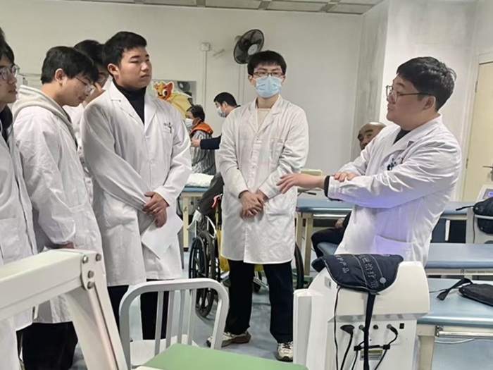 在康复治疗大厅,学生系统学习了现代康复设备的临床应用。带教团队现场演示了电动起立床的神经功能重建技术、体外反搏机的心肺康复原理,以及空气压力治疗仪的循环改善机制。学生在医师指导下完成设备参数设置、患者体位调整等标准化操作流程,并参与制定个体化康复方案。“临床操作让我直观理解到,康复治疗需要精准的医学判断与人性化服务相结合。”学生彭曼雅在实践报告中写道。