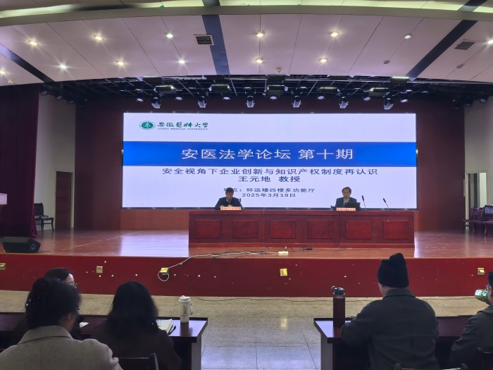 3月19日,法学院在南校区怀远楼四楼多功能厅举办第十期“安医法学论坛”,全国知识产权专业学位教指委委员、中国科学技术大学公共事务学院教授、博士生导师王元地受邀担任主讲嘉宾。本次论坛以“安全视角下企业创新与知识产权制度再认识”为主题。法学院院长马青连主持论坛并致辞。
