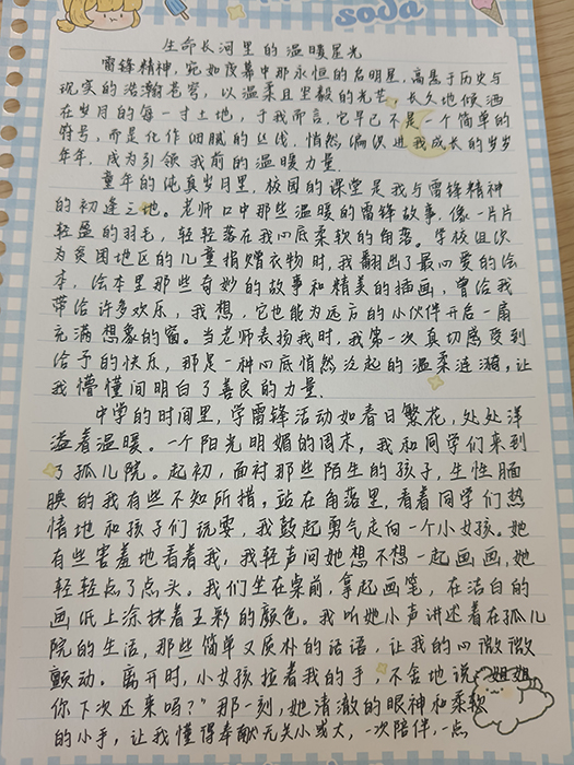 学院还精心策划了“锋采华章”主题征文比赛,收到投稿百余篇。参赛作品从“门诊室里的温暖瞬间”“科研中的钉子精神”等角度切入,既有对雷锋精神时代价值和内涵的剖析,也有对学习生活感悟的生动记录。“当牙科灯照亮患者口腔时,我们手中的口镜不仅要探查龋齿,更要映照出医者对生命的尊重。”2024级本科生曹玉涵写道。