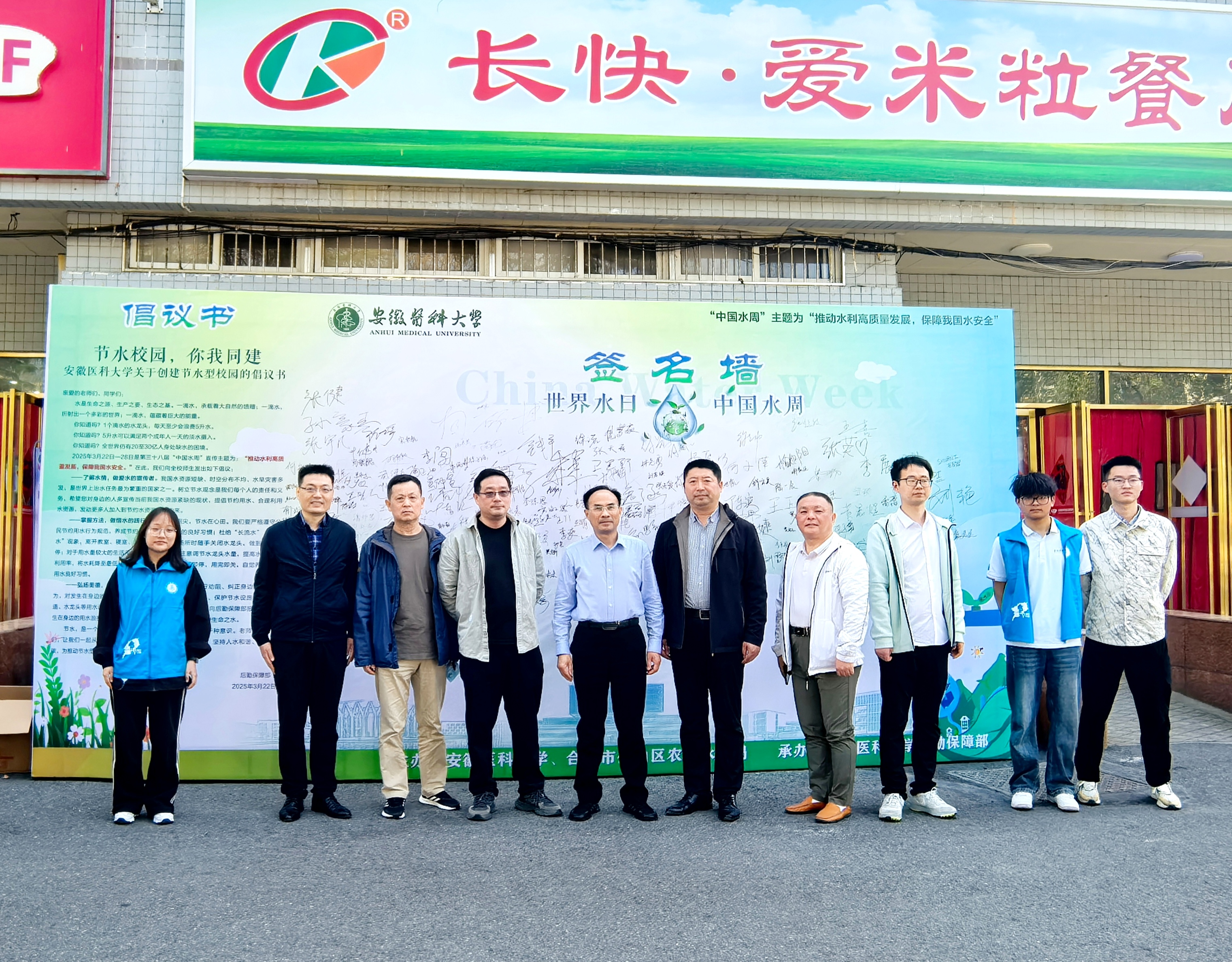 座谈会后,双方共同开展以“推动水利高质量发展,保障我国水安全”为主题的中国水周签名活动,在梅山路校区一食堂门口实地参与校园节水宣传。现场气氛热烈,志愿者发放节水宣传手册和印有节水宣传标语的小礼品,呼吁师生节水从自身做起,从点滴做起,在学习、工作和生活中践行保护水资源的使命担当。师生们积极参与,在签名墙上签下自己的名字,以此表达对节水事业的关注和支持。