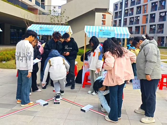 学院志愿服务队的同学结合所学专业知识,以“Y平衡”测试体验为核心内容,借助基础设备为同学们评估下肢动态平衡能力,帮助参与者了解运动损伤风险,提供个性化运动建议。志愿者们不仅细致解读数据,还现场演示了平衡训练动作,将专业知识转化为实用健康服务。现场同步开展的气球小狗制作活动,用童趣方式传递心理抚慰技巧,展现“医学的温度不仅在于治愈,更在于疗心”"的人文理念。