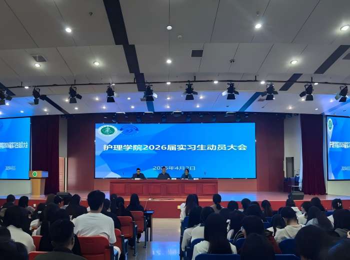 4月2日学院2026届实习生实习动员大会上,院党委书记薛磊提醒学子们要严格遵守工作纪律和实习医院科室规章制度,展现安医大护理学子的良好风貌,同时,要善于在实践中学习,不断提升自己的专业技能和综合素质,为未来的职业发展奠定坚实基础。副院长赵梅就毕业论文和护理技能大赛作提前部署。
