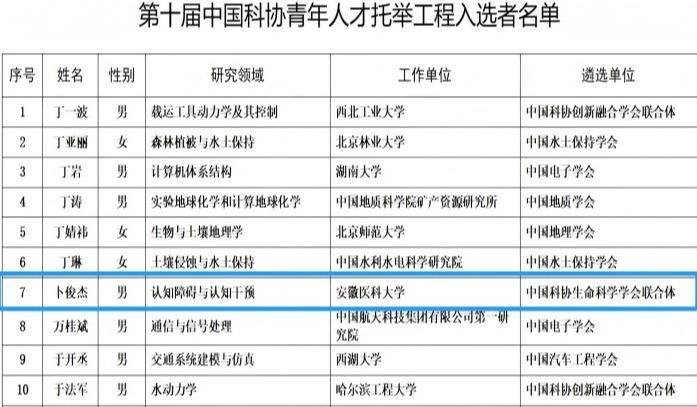 近日,中国科协公布第十届青年人才托举工程入选名单,我校生物医学工程学院卜俊杰副教授入选。这是青年人才托举工程自2015年设立以来,我校首位由中国科协资助的入选者,也是本届安徽省高校在医学和生命科学领域的唯一入选者,我校汪凯教授是其校内推荐专家。