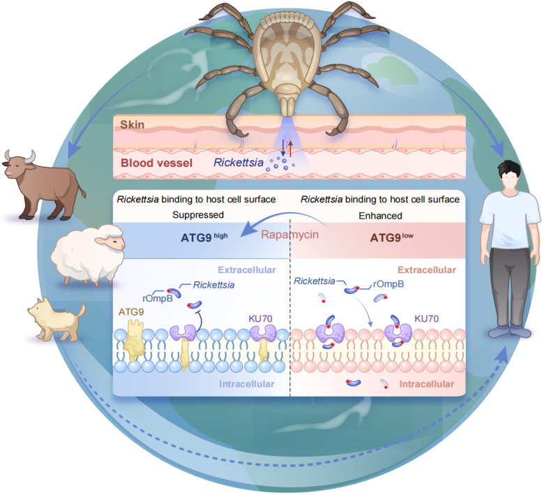 该项研究借助基因编辑技术和功能筛选发现,自噬相关蛋白ATG9通过一种不依赖于自噬的途径阻碍立克次体感染人细胞。通过质谱和分子生物学研究,结果揭示ATG9可竞争性阻碍OmpB与KU70的结合,从而在感染早期抑制立克次体黏附宿主细胞。小鼠模型中结果显示,雷帕霉素可显著上调组织器官中ATG9的表达水平并抑制OmpB介导的感染。研究为临床开发立克次体病的治疗策略提供了新思路和理论依据。