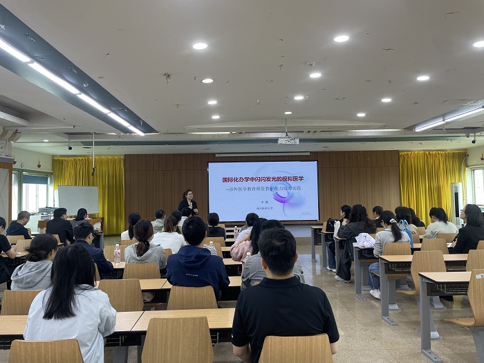 5月9日,国际学院联合校教师发展中心,邀请南方医科大学、南方医院医学模拟中心运维负责人李薇教授来校讲座,进一步提高学校教师英语授课能力,为举办全国来华留学医学本科教育青年教师英语授课展示活动校赛预热。国际学院副院长黄艳主持讲座。