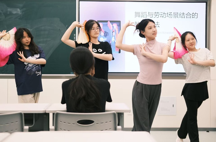 了解艺术之美,学习劳动智慧。戏曲不仅蕴含了唱、念、做、打的技艺,更是一部由汗水、筋骨与匠心编织的劳动史诗。在学院特色的戏曲和花鼓灯艺术实践课程中,教师以“劳动美学”为切入点,讲解戏曲艺术的台前幕后,揭示传统文化视域下劳动者的创造力和情感表达。学生们通过模拟插秧、筛谷等农耕动作,学习“簸簸箕”“拾棉步”等经典舞蹈语汇,在身体力行中感受劳动人民的智慧以及中华民族传统美德。“劳动模拟+艺术提炼”的创新教学方式,充分点燃了同学们的学习热情,得到大家的一致好评。