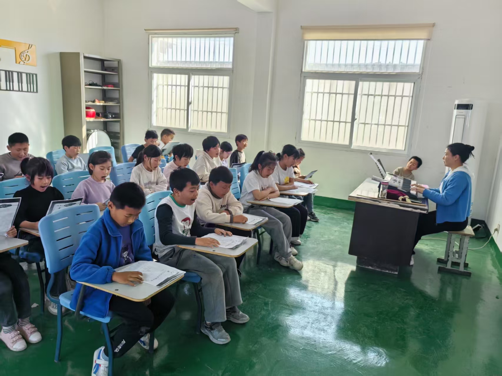 经过屋顶防水、地胶铺设、空调加装等一系列装修改造后,村小学音乐教室焕然一新,成为小学美育的新空间,让村里的孩子们在接受音乐教育中发现美、感受美、创造美。