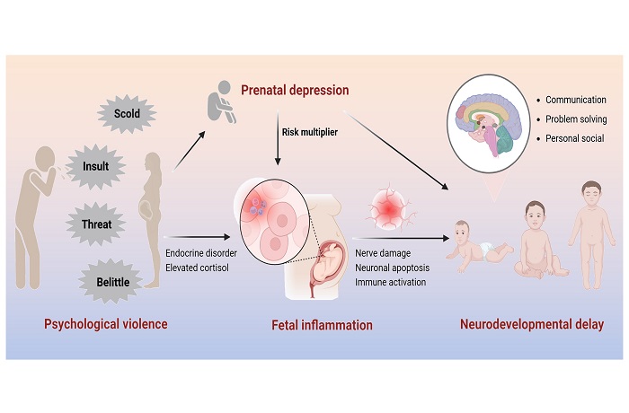 该研究基于课题组建立的合肥母婴健康队列(Maternal and Infant Health cohort study in Hefei,MIH-Hefei)发现,孕期心理暴力与婴儿的沟通、解决问题、个人-社会能区发育迟缓的风险增加显著相关,孕期心理暴力可通过促进脐血炎症水平升高,影响胎儿脑发育,增加婴儿期神经发育迟缓风险;遭受孕期心理暴力后若伴发抑郁症状,则会进一步推动脐血炎症水平升高,加剧婴儿的神经发育损伤。
