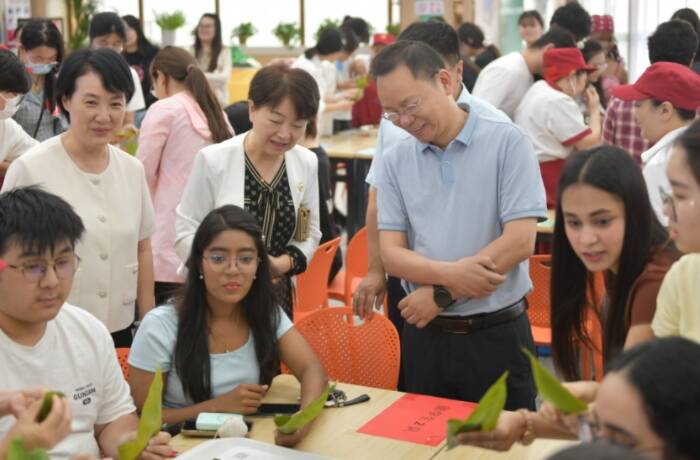 本次活动围绕党建引领、劳动实践和服务育人三项内容开展,通过包粽子比赛、中医药香囊制作、非遗漆扇绘制等丰富多彩的形式吸引上千名学生参与,共同感受节日氛围,弘扬中华传统文化。活动在包粽子比赛中拉开序幕,国内学生队与国际学生队展开速度与技巧的比拼,让粽叶、糯米、蜜枣在双手翻飞间变成一个个精巧的粽子。一个个粽子的出品和“端午传统文化有奖问答”也将活动推向了高潮。