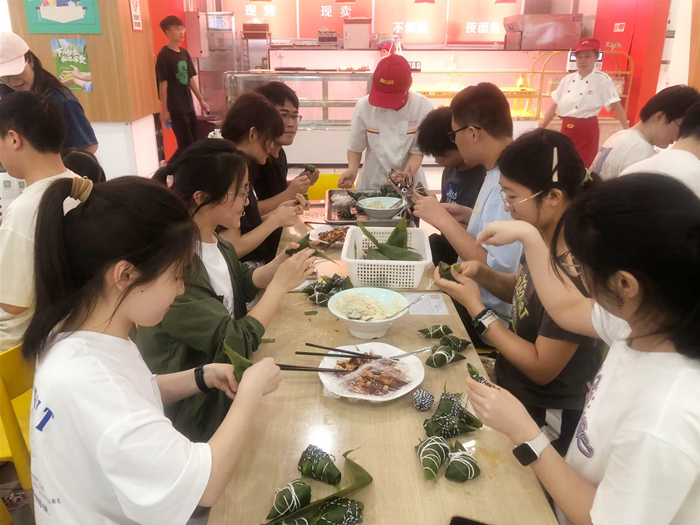 食堂为大家准备了泡好的糯米,辅以蜜枣、咸蛋黄、五花肉等各类馅料。在食堂专业厨师和工作人员的演示和指导下,包粽子活动正式开始,同学们四五人一组,取粽叶、卷圆锥、装馅料,系粽绳。一开始虽不熟练,包出来的粽子也形态各异,但大家一边认真学习手法,一边实践改进,后包出的粽子终于有了“卖相”——棱角分明,饱满有料。