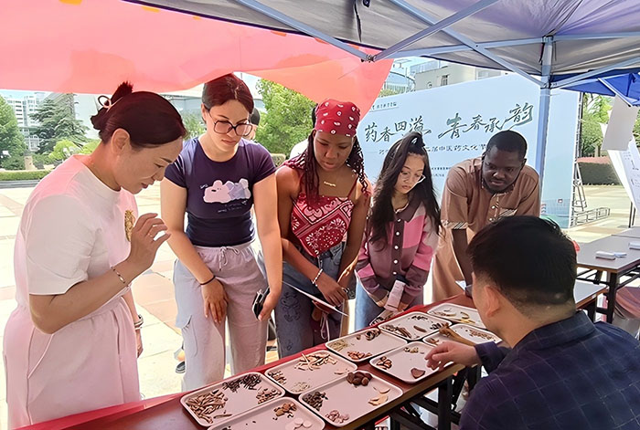 值得一提的是,众多国际学生也在志愿者的热情协助下积极参与到活动中来。他们踊跃参加中医药知识问答竞赛,认真思考、热烈讨论一道道题目,展现出对中医药文化的浓厚兴趣。在中药材标本展示区,国际学生饶有兴致地观察着琳琅满目的标本,不时向志愿者和老师询问药材的特性与用途。他们还亲手制作端午香囊,感受中医药文化的博大精深,进一步激发了学习中华优秀传统文化的热情。