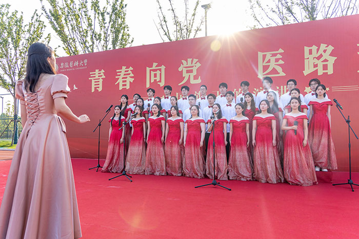 合唱歌曲《我们走进十月的阳光》唱响了新时代青年对伟大祖国的无限热爱和对美好生活的由衷礼赞。同学们以嘹亮的歌声、优美的旋律,充分展现了安医学子朝气蓬勃、昂扬向上的精神风貌。