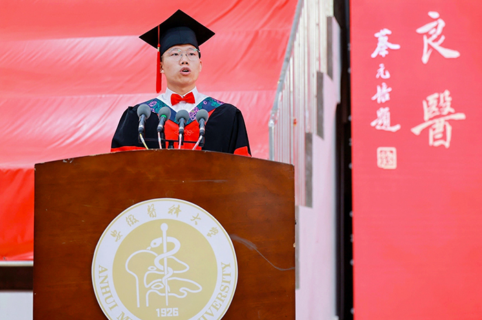 来自第一临床医学院(第一附属医院)的陶博睿、张雨阳,国际学院的章伯涵,分别作为本科生、研究生、来华留学生毕业生代表发言。