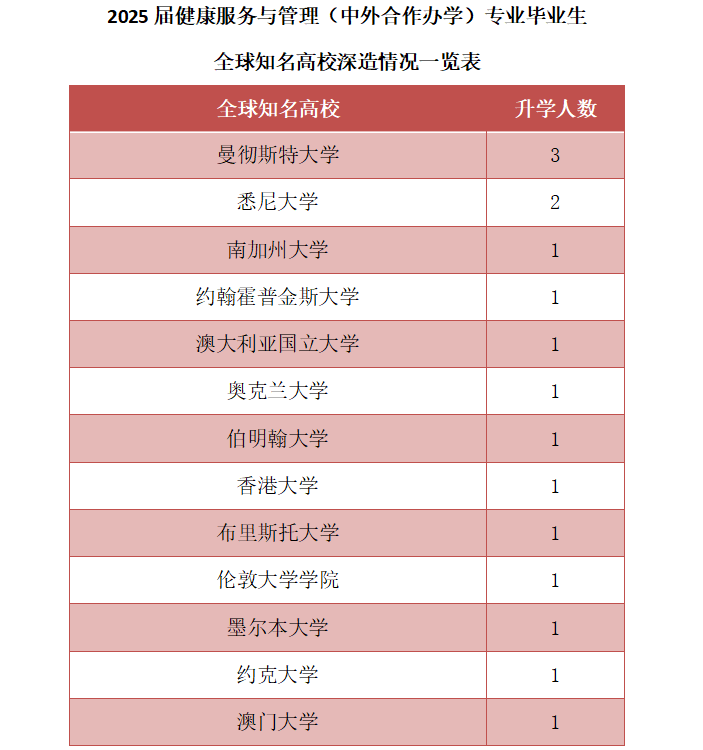 此次升学成果不仅体现了该专业学生的卓越能力和国际竞争力,也充分展示了中外合作办学的独特优势和良好前景。未来,健康服务与管理(中外合作办学)专业将继续秉承“立足中国、放眼世界”的理念,致力于为国家卫生健康事业和全球公共健康治理培养更多具有国际视野与本土实践能力的高素质复合型人才。(卫生管理学院 国际学院)
