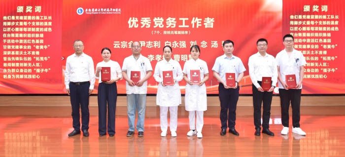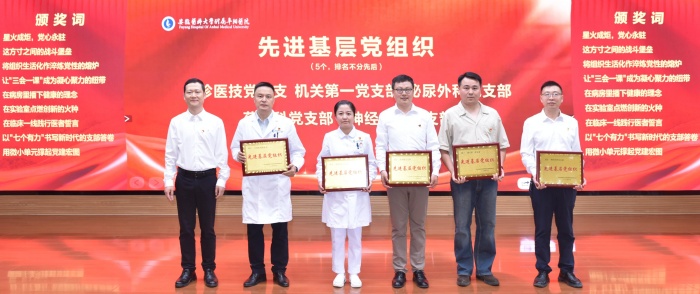 孙其虎代表院党委、行政向受到表彰的先进集体和先进个人表示祝贺,向勤奋工作在医院医疗、教学、科研、管理等各领域的共产党员致以崇高的敬意和节日的问候。他表示,学校第九次党代会明确提出创建“双一流”大学“三步走”的战略目标。站在医院新的发展起点上,各级党组织和广大党员要坚定信念,对党忠诚,坚定共产党人的追求,以高质量党建引领事业高质量发展。要扎实开展深入贯彻中央八项规定精神学习教育,集中整治违反中央八项规定精神的突出问题,营造风清气正、干事创业的良好氛围。要坚持攻坚克难、笃行不怠,抓紧抓实年度重点任务,以实干担当为高质量发展蓄势赋能。