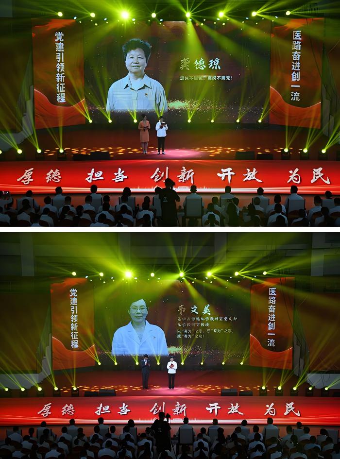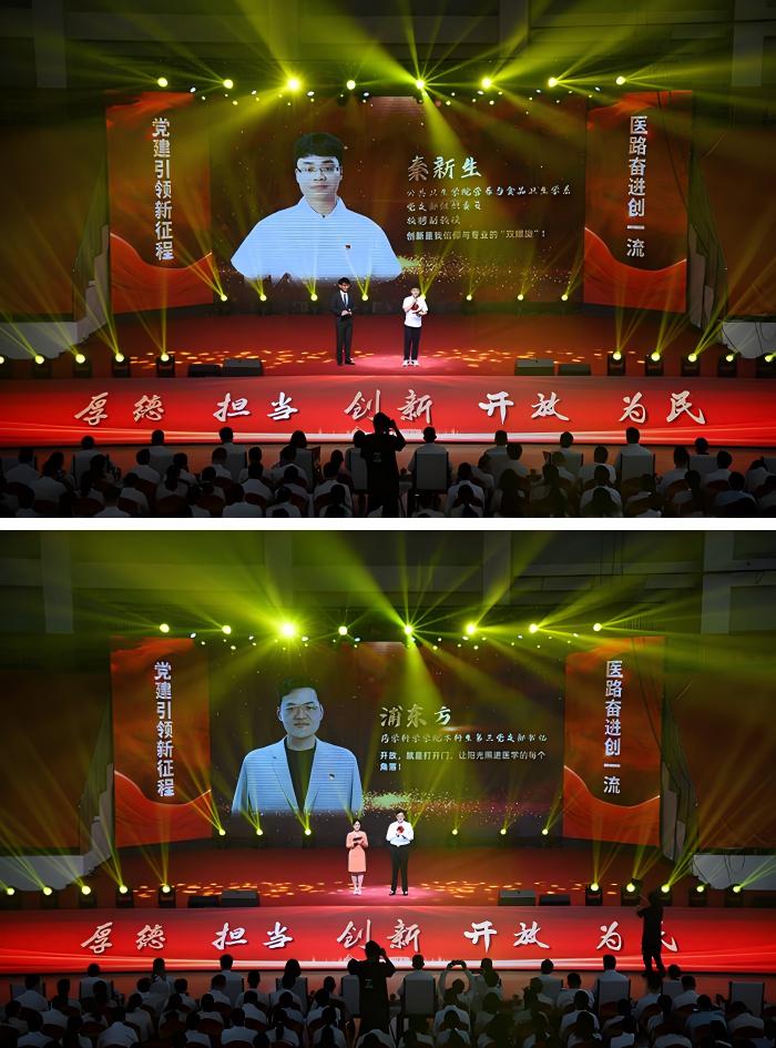 本次表彰大会相较往年,多了一个特殊的环节——随着动人音乐和画面的徐徐展开,5位党员代表逐一登台亮相,分享他们扎根医疗教育一线的真实故事。离退休教职工党委龚德琼讲述的“厚德安医”,体现了老一辈安医人坚守教育战线、传承红色血脉的高尚情怀;基础医学学院党委韦文美带来的“有为安医”,展现了安医教师群体在教学科研中默默奉献的精神风貌;公共卫生学院党委秦新生阐述的“创新安医”,彰显了安医科研人敢为人先的探索精神;药学科学学院党委浦东方讲述的“开放安医”,展现了学校在国际合作与交流中的开放姿态;第一临床医学院党委付红分享的“幸福安医”,体现了安医人以专业为盾、以仁爱为灯的医者仁心。