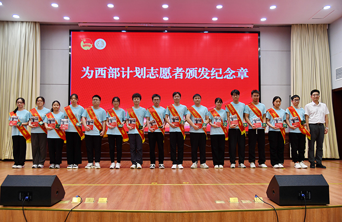 启动仪式上,邱志海为校级重点团队代表授旗,为西部计划志愿者颁发纪念章并赠送了书籍。