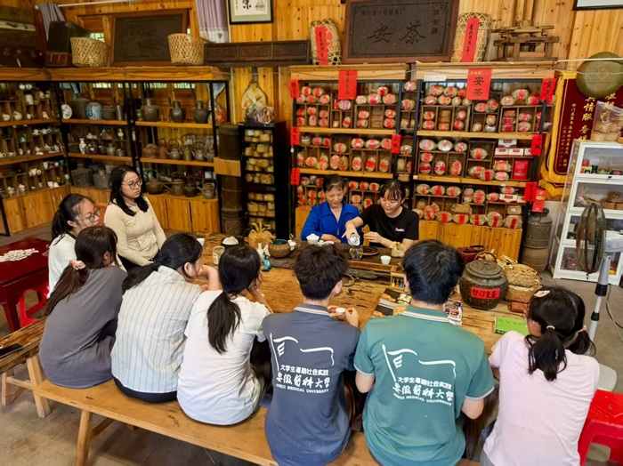 实践活动期间,团队成员参观了国家级非遗祁门傩舞传习所、国家级非遗祁门红茶手工坊,近距离感受当地“非遗”的美学魅力,还就当地康养产业现状、居民健康情况展开问卷调查,并向村民们宣传了健康卫生知识。团队成员、2023级运动康复系学生张蕾表示:“非遗蕴含着丰富的美育资源,此次活动让大家在感知、体验中深入了解了更多的中华优秀传统文化,也陶冶了高尚情操。作为医学院校大学生,我们要积极传播安茶的康养价值,为健康中国建设贡献青春力量。”
