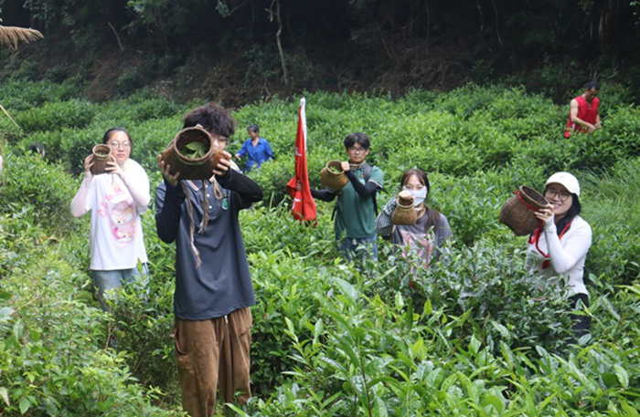 同学们来到芦溪乡一枝春茶园基地,亲手采摘茶叶并在非遗传承人严君凤的指导下,进行茶叶杀青、揉捻、渥堆、烘干及编竹篓等多道工序,完成了从鲜叶到茶叶的制茶流程。在安茶文化品鉴馆,严君凤向大家详细介绍了安茶的起源、历史变迁,重点讲解了安茶的康养功能、冲泡技巧及品鉴要领。
